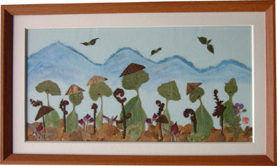 この作品はふきの葉に出逢い形を見ているうちに顔と胴体(体)に思えてきて・・・出来上がった押し花額です。